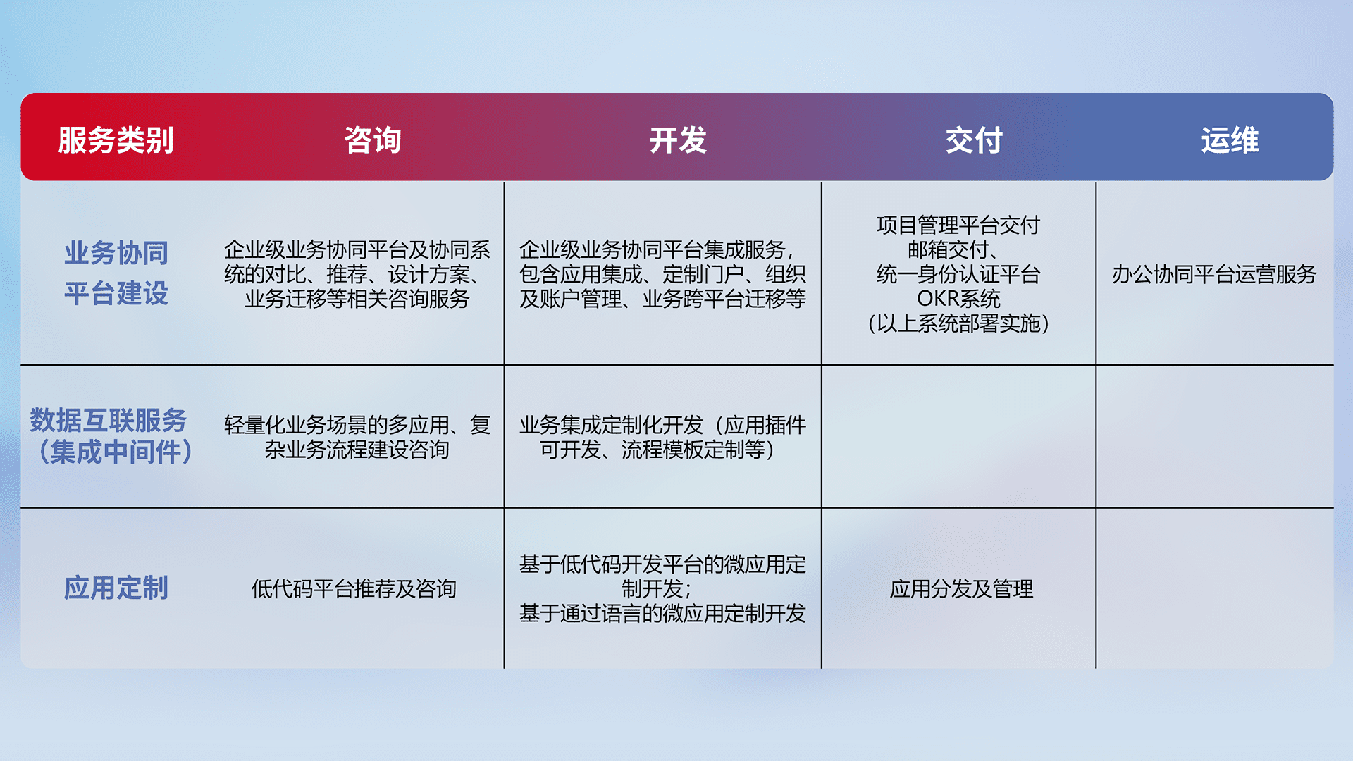 针对钉钉、、、企微、、、、IDaas等平台级产品提供产品的规划、、、、方案、、交付、、定制化开发等服务,,,,实现如统一协同办公、、智能客户服务、、混合会议管理、、智能数据查询、、等业务场景,,实现数字化转型。。。