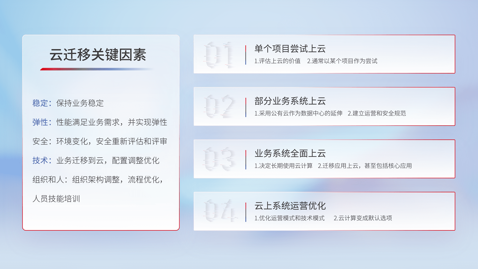 结合实际业务,,,从规划设计、、云平台选型、、、云原生改造、、数据迁移、、、集成交付,,,迁移全过程为客户识别最佳上云路径,,,做好风险识别管理,,,,设计网络架构、、、、身份权限、、安全审计合规、、、、操作审计、、、、日志审计、、监控告警策略、、多站点容灾设计等,,,对云上基础设施进行整体规划,,,,提升IT治理水平,,以满足弹性、、高可用、、、高性能的需求。。。。