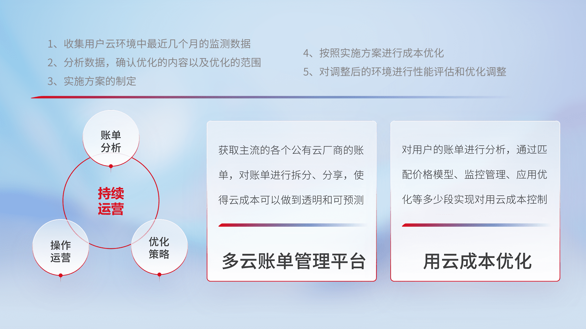 通过多云纳管,,,以统一的资源数据模型把客户的云资源进行抽象和封装,,,,进而实现对多云资源的统一操作,,保障云资源管理的可靠性、、、稳定性与可用性。。量身定制化运维内容,,配置、、开发运维、、、补丁管理、、、备份、、监控、、、、认证和访问管理、、、审计和日常巡检等,,,,保障在用云过程中的可靠度,,稳定度以及高可用率。。。。